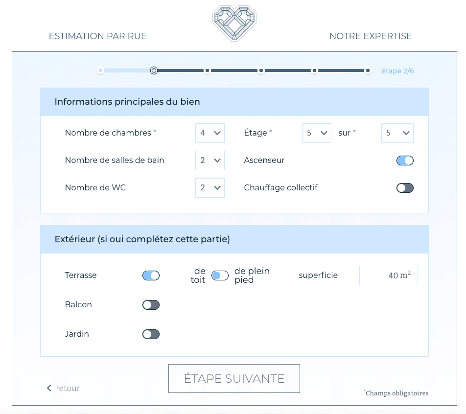 Certaines réponses sont obligatoires. Dans ce cas, elles sont indiquées par un astérisque rouge. Il s’agit des critères indispensables à la bonne estimation de votre bien comme le nombre de chambres ou l’étage auquel se situe votre bien.