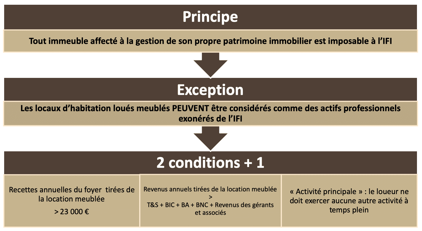 LE CAS PARTICULIER DE LA LOCATION MEUBLÉE :LMP OU LMNP ?La location meublée professionnelle (LMP) est définie par le montant des revenus de la location : À partir de 23.000€ dans l’année ET s’ils représentent au moins 50% des revenus du foyer fiscal de l’investisseur, on parle de Location Meublée Professionnelle (LMP).