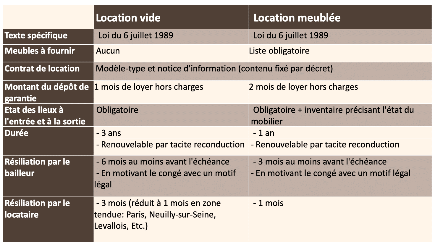 Sur le plan juridique, les différences entre la location meublée et la location nue se concentrent principalement au niveau :