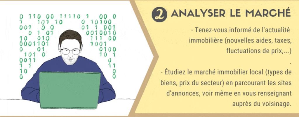 Pour que vos critères soient réalistes et que vous puissiez avoir une idée du budget, il faut analyser le marché. Pour cela, tenez-vous informé de l’actualité immobilière générale (nouvelles aides, taxes, fluctuations de prix,…) et étudiez le marché local, celui de votre secteur de prédilection (types de biens, prix au m2, Etc.). Vous pouvez par exemple parcourir les sites d’annonces et vous renseigner auprès du voisinage.