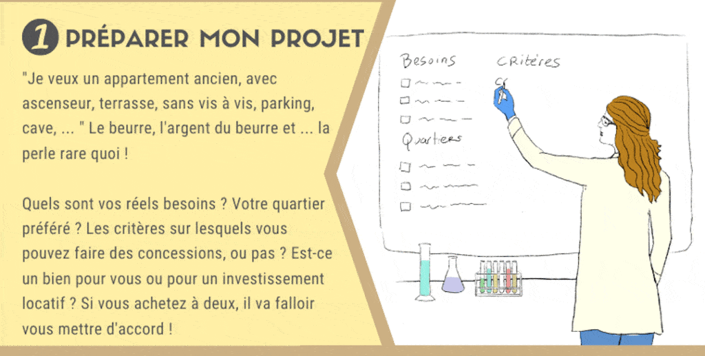 Comme pour tout projet, un achat immobilier se prépare. Quelles sont vos envies ? Vos critères ? Si vous souhaitez un appartement dans de l’ancien, à Paris, au dernier étage avec ascenseur, sans vis à vis, avec parking et cave, le tout pour un petit prix … Et bien, il va falloir revoir vos critères !