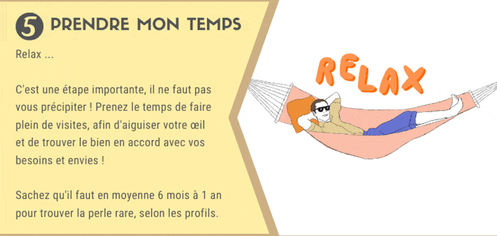 Et oui, c’est primordial de savoir prendre son temps, de poser les choses, de prendre un peu de recul. Acheter un bien immobilier est une étape importante et souvent source de stress. Alors ne vous précipitez pas. Prenez le temps de faire plusieurs visites, d’ouvrir vos horizons et d’aiguiser votre oeil ! Sachez qu’il faut en moyenne 6 mois à 1 an selon les profils pour trouver la perle rare 🙂