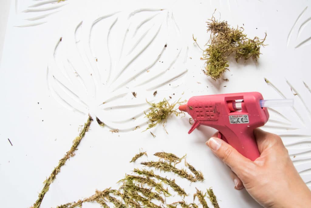 Avec le pistolet à colle, appliquez un peu de colle au fond de chaque fente, et collez y la mousse. Procédez progressivement car la colle chaude sèche très vite !