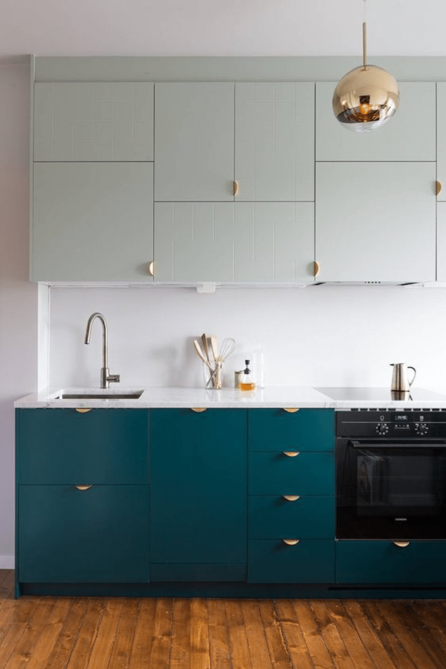 Une cuisine dynamique et tendance avec du bleu canard et des poignées art déco en laiton ! © Déavita