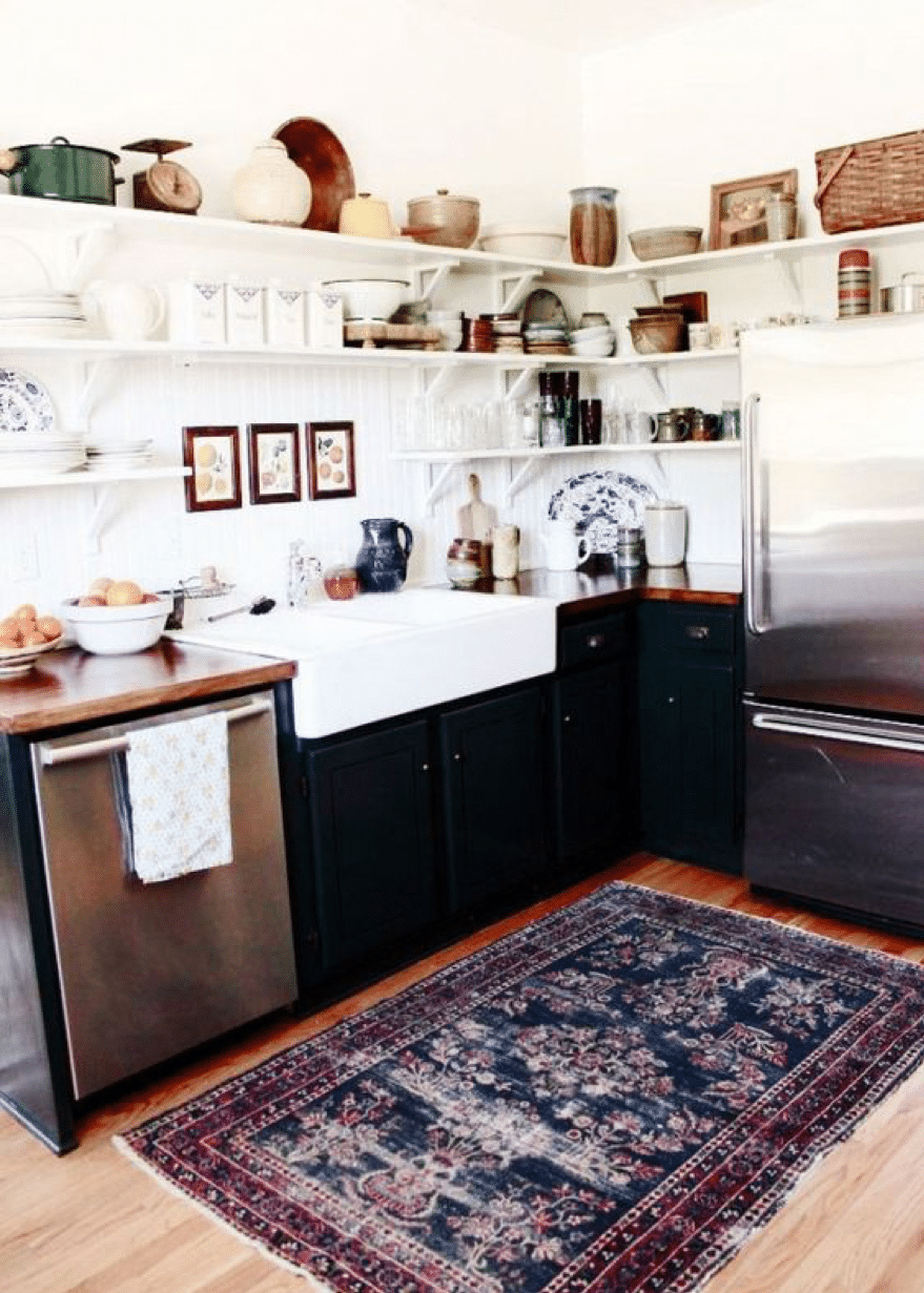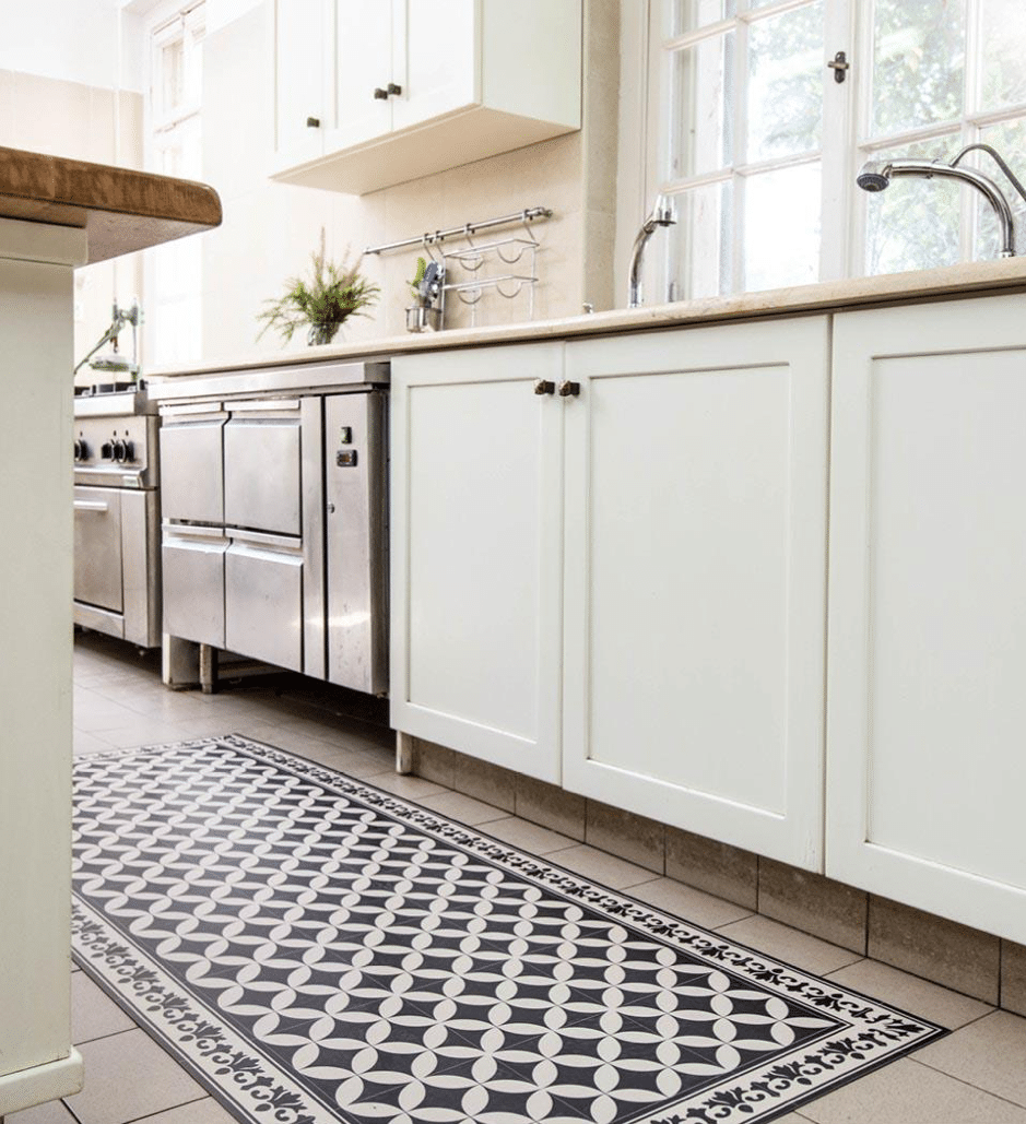 Si vous n’avez pas envie de faire l’effort et de dépenser pour changer le sol de votre cuisine, mettez tout simplement un tapis ! Vous trouverez des tapis en vinyle ou adhésifs façon carrelage ou mosaïque (attention à ce que ça ne fasse pas trop cheap tout de même). La marque Beija Flor est spécialiste dans le domaine et propose toutes sortes de motifs. Autrement, un vrai tapis en tissu ajoutera une touche cosy et chaleureuse à votre cuisine !