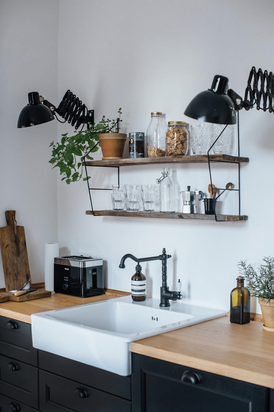 Une touche de style garantie dans la cuisine 🙂 Et pour accentuer le tout, vous pouvez repeindre votre évier avec une peinture spéciale. Par exemple, adoptez un total look noir ou bien un évier noir avec un robinet or !