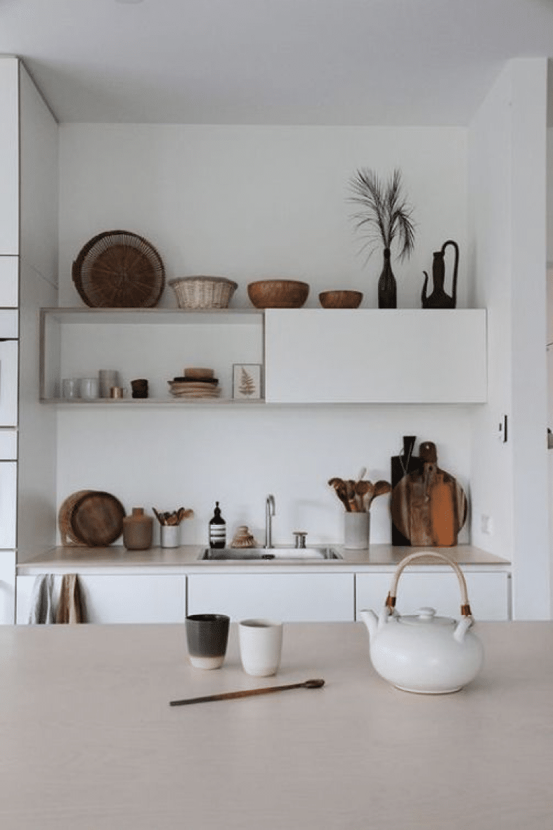 Encore faut-il qu’elle soit belle, cette vaisselle, vous n’allez pas exposer les assiettes en plastique ou les mugs des boutiques souvenirs ! Non, choisissez une vaisselle aux tons doux, pastels, des tasses en céramique qui se marient bien avec les couleurs de votre cuisine. Accumulez de la vaisselle et des bocaux sur les étagères, suspendez des ustensiles en bois ou en cuivre, des planches en marbre, du linge de table en lin. Vous pouvez vous inspirer de la belle sélection art de la table chez Hello Blogzine.