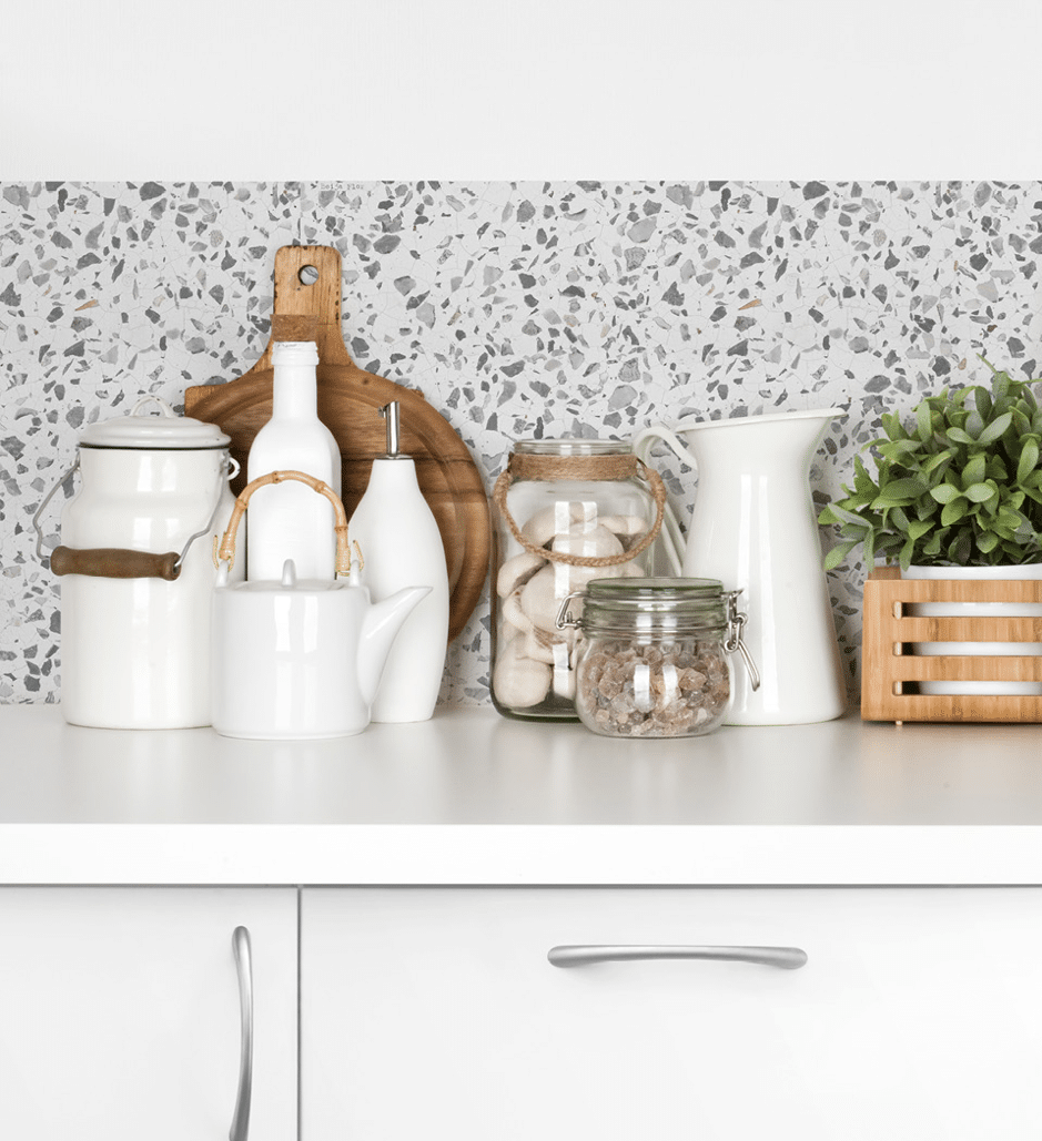 Vous avez probablement du carrelage sur le mur de votre cuisine ou bien juste en crédence. Comment faire pour le changer sans avoir à tout enlever, surtout si vous êtes locataire ? Vous pouvez soit le repeindre avec une peinture spécial carrelage, soit le recouvrir d’un adhésif pour un effet trompe-l’oeil ! Il existe des crédences adhésives façon mosaïque, matière brute ou encore terrazzo, pour être à la pointe de la tendance 🙂