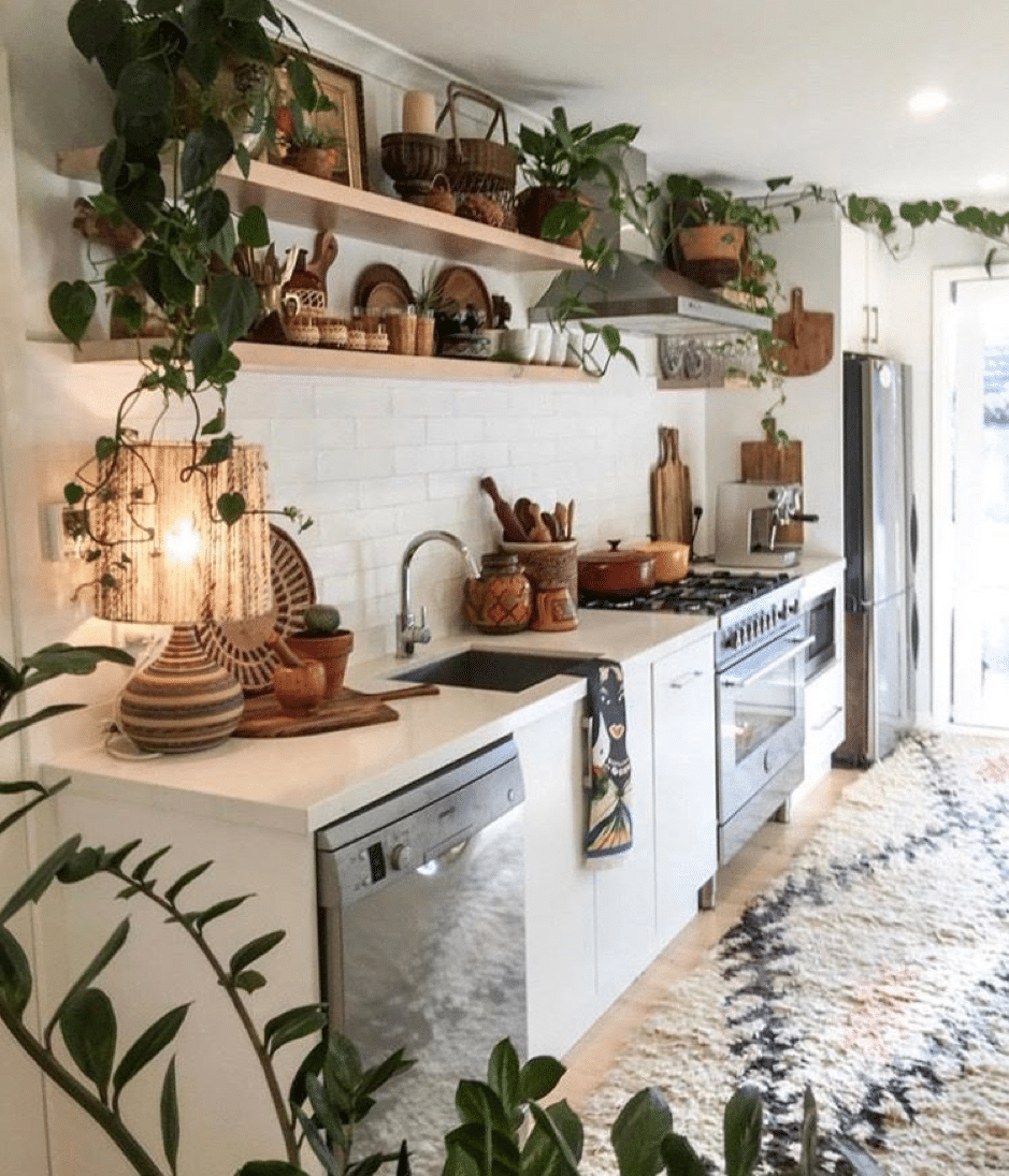Toujours dans cette tendance de retour au vert et dans un besoin de bien-être, ajoutez de jolies plantes vertes en déco et quelques aromates. Notre volonté de mieux consommer se traduit dans la cuisine, voilà une bonne raison de cultiver vous-même vos aromates et d’en faire une jolie déco sur des étagères ou des pots suspendus.