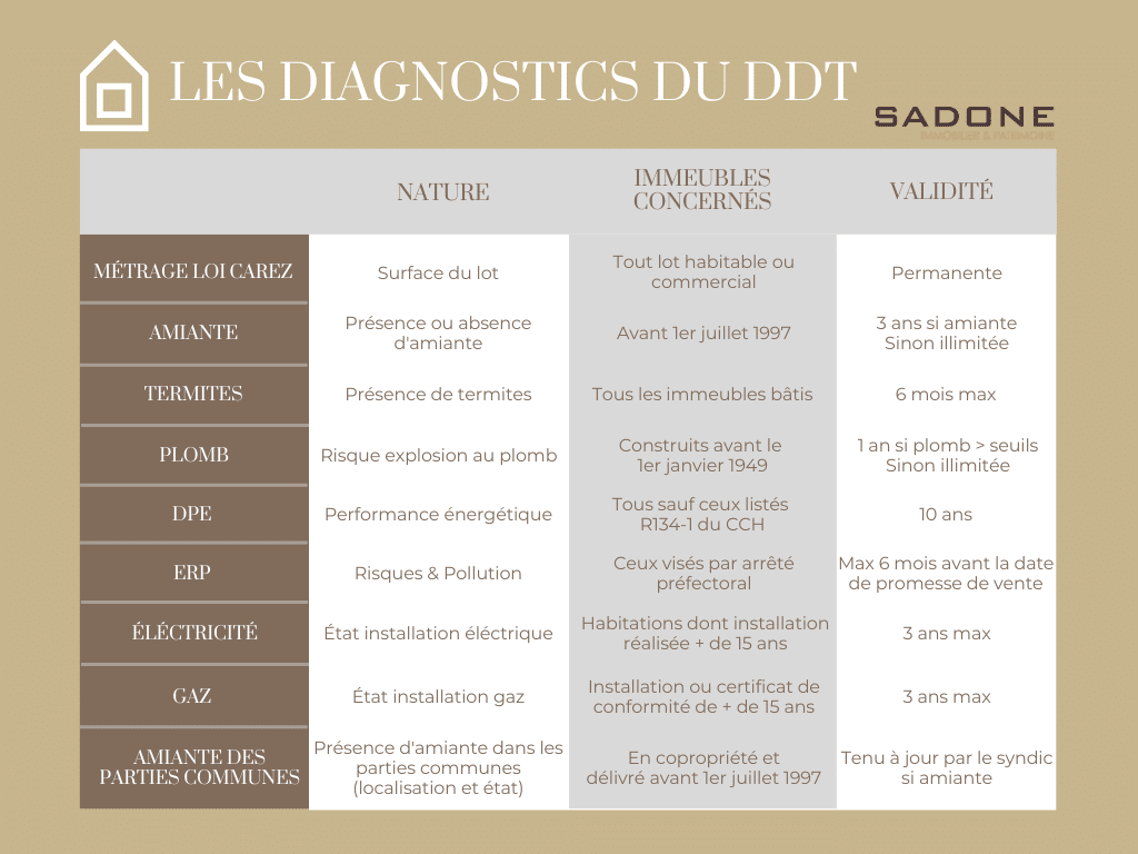 Pour compliquer un peu les choses, les diagnostics ne sont pas les mêmes en fonction de la construction du bien et n’ont pas les mêmes dates de validité. Alors pour y voir plus clair, vous trouverez tous les détails de chaque diagnostic que doit comporter votre DDT !