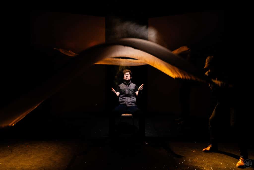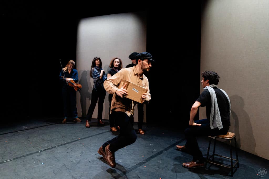Dans Coupures, on fait une mise en scène avec trois fois rien où un drap peut devenir un bébé, une nappe ou un élément de décor… C’est assez rapide en termes de traitement, c’est très cinématographique comme mise en scène. Et puis c’est un spectacle qu’on a créé en janvier 2022 au Théâtre de Belleville et qui a vécu une belle histoire. Assez rapidement, Alexis Michalik a vu le spectacle et a eu un gros coup de cœur. Il en a beaucoup parlé autour de lui donc on l’a repris en mai au Théâtre de Belleville. Puis il a été repris à La Scala Provence au Festival Off d’Avignon en juillet dernier. Et puis là on arrive dans cette magnifique salle du Théâtre de l’œuvre et on s’y installe pour 4 mois avec, en prime, la chance d’être éligibles aux Molières. C’est une très jolie histoire qui se raconte avec ce spectacle pour toute la compagnie.